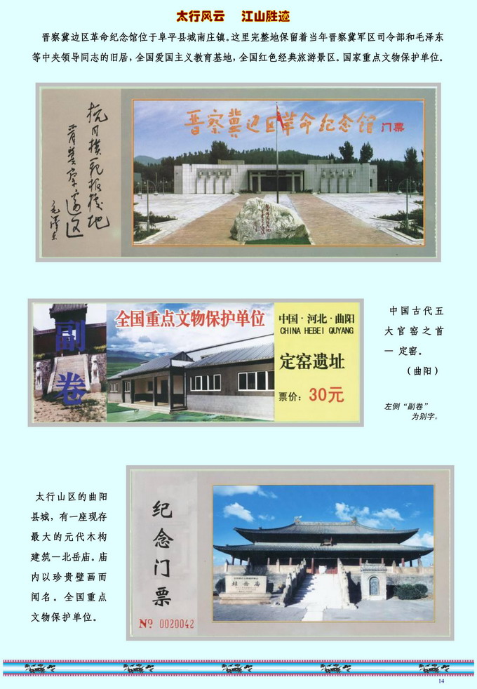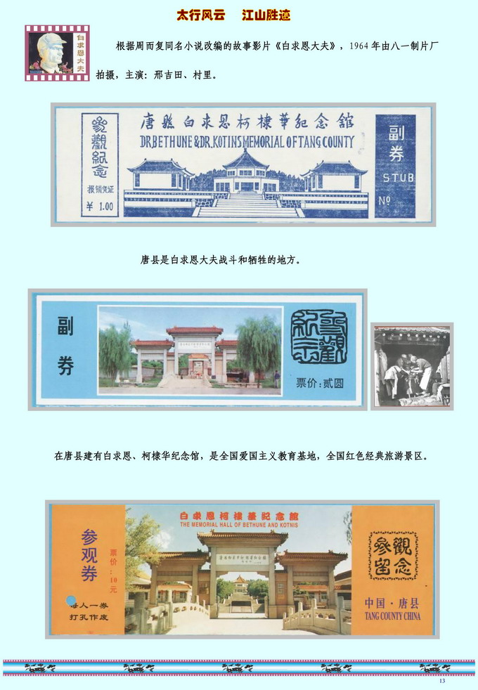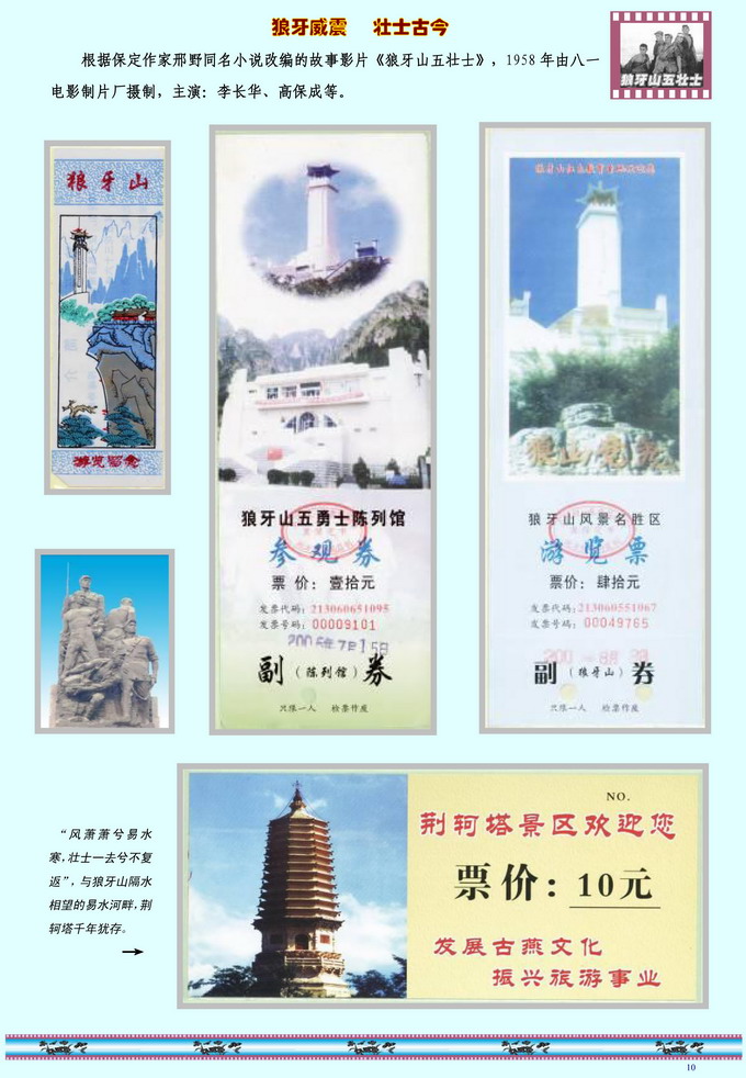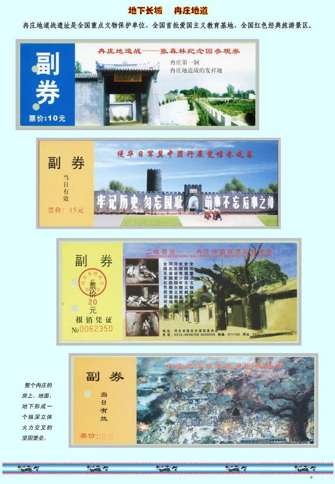 序 言 这个专题的创意源于2007年中央电视台“完美假期”栏目举办的全国十佳旅游路线评选,保定以《跟着老电影去旅行》为题,以老电影《地道战》、《小兵张嘎》、《狼牙山五壮士》为主线,串起冉庄地道战遗址、白洋淀、狼牙山等景点的一条旅游路线参评,经全国观众投票评选,该线路以总票数第四入选全国十佳旅游路线。除以上三部电影外,老电影《野火春风斗古城》、《白求恩大夫》、《红旗谱》、《青春之歌》、《平原游击队》的故事都发生在保定,这些红色经典电影家喻户晓,教育影响了几代人,这些电影故事的发生地现今都成了爱国主义教育基地。我生在保定、长在保定,从小看着这些老电影长大,以保定有这么多红色旅游资源为荣。我要以门券为载体,向观众介绍保定的红色旅游景点,介绍保定众多的文化古迹和秀美的自然风光,为促进保定的旅游事业尽一点力。 本专题共两框18个贴片57张门券,在编排上是每一部电影串起一组旅游景点,以红色旅游景点为主,另外介绍了知名度较高的全国重点文物保护单位、国家级风景名胜区,整个专题分6小部分:经济重镇—保定市、华北明珠—白洋淀、地下长城—冉庄地道、狼牙威震—壮士古今、太行风云—江山胜迹、烽火宏图—旧貌新颜。门券选用了一些珍稀券种,如6枚一套的冉庄地道战早期塑料券、清西陵4枚一套的早期外宾券、保定军校和留法勤工俭学纪念馆立体画特种门券、只使用了10天的直隶总督署明信片门券、已绝版的小兵张嘎纪念馆券,前3种门券推荐参加“我最喜爱的新中国旅游门券”评选并已入围200套参加复选。 在这个专题形成过程中,王建池会长几次组织保定券友们针对创作中的问题进行讨论、推敲,陈明新老师不吝投入精力支持,在此一并致谢! 今借“券研网”将拙作予以展示,诚恳希望得到方家点评、指导。