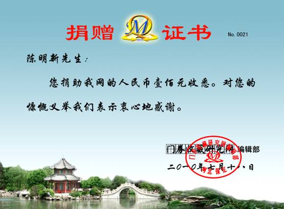 附:编辑部向陈明新先生颁发的《捐赠证书》