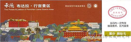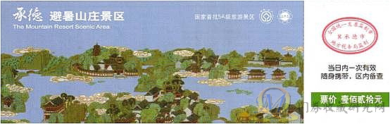 左图为仿布达拉的普陀宗乘,右图为仿扎什伦布的须弥福寿,工笔细绘,形状逼真,色调鲜明。图中未见庙后群山,却四周绕以嵯峨峻石,凸现建筑雄伟高大,且平添几分奇异神秘,点缀之树,皆粗干古木,昭示历史久远,团云缭绕,则衬托出佛国祥和。可谓笔笔皆有深意。 之二为《避暑山庄景区》券。