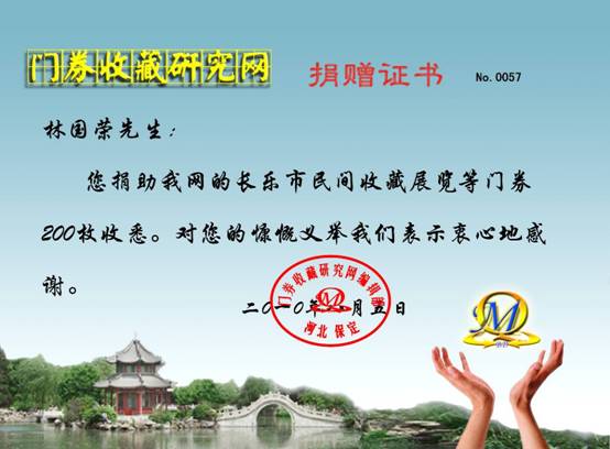 门券收藏研究网编辑部 二0一0年八月五日 附:1、林国荣先生捐赠的门券