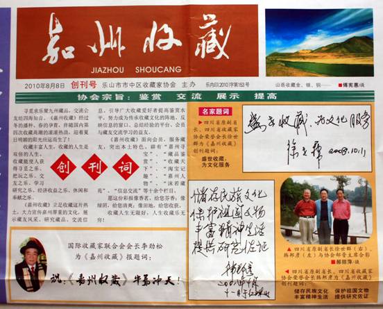 嘉州地灵出俊杰,藏苑花香添奇葩。由乐山市门券收藏协会会长、乐山市市中区收藏家协会主席郜晋先生为主编的《嘉州收藏》报于2010年8月8日创刊。为表祝贺,我网编辑部赠诗一首: