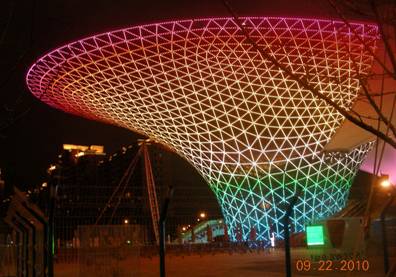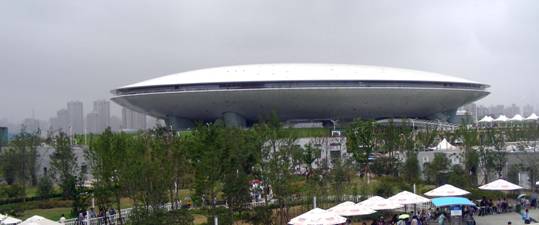 翌日,是中秋节,会议没有其他安排。于是,按在北京就订好的计划,参观上海世博会(门票在京已经备妥)。 我的特定条件是:六十多岁的年龄、一天的参观时间,又恰逢中秋节(事后统计表明,当天的客流量是48.7万人)、没有具体的考察项目、只能承受普通的消费。 在这些不可改变的条件下,我该怎么游世博呢? 参观世博会,当然应该看中国馆,但是中国馆只接待预约的观众,而且还要再排几个小时的队。日本馆、沙特馆、德国馆、英国馆、加拿大馆、瑞士馆、美国馆、俄罗斯馆……凡是名气大一些的展馆,都得再在馆外等候2—6个小时,对我来说,绝对没有这个时间,也没有这个耐心,所以只好忍痛割爱。 各个专业展馆,像航空馆、信息通讯馆、铁路馆、石油馆等,对我这个门外汉也看不出个子丑寅卯,况且馆址分散,距中心地域较远,也就划到放弃之列。 这个割爱,那个放弃,那我到世博会究竟能看什么呢? 世博会的参展方有240个国家和地区组织,投资成本约450亿人民币 ,会场面积达5.28平方公里 ,在这么大的范围内,看点多得很,找准适合自己的方式,就会有最大的收获。 我的选择是:看文化、看创意、看形式、看规模、看气势、看氛围。 世博会是文化创意的竞赛和角逐,参观世博会首先是看文化。 名为“创意之馆”的英国馆,外部由大量向各个方向伸展的触须组成,每根触须顶端都有一个细小的彩色光源,看上去就像一个会发光的盒子,建馆所用建筑材料都可以循环利用,整个建筑的碳排放量将为零。