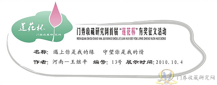 2009年10月,我参加了在陕西黄陵举办的全国第16届门券展,期间,我遇到了德高望重的王建池站长,见面后,王建池站长为我送了一份厚礼,一个大信封内装有数十张精美门券和一个《门券收藏研究网作品选集》光盘。 2010年春节前,一封来自《门券收藏研究网》编辑部的“恭贺新春”大红信笺,使我感动。信中说:“尊敬的王继平主编:您好!值此辞旧迎新、虎年将至之时,门券收藏研究网编辑部全体同仁向您及贵刊编辑部全体朋友拜年。恭祝新年快乐!全家幸福!!集藏日丰!!!......”字里行间,我仿佛看到,这不是一封普普通通的信,这分明是门券收藏研究网编辑部对券友的一颗真诚和火热的心。 2010年夏季,门券收藏研究网站举办首届“莲花奖”门券展活动,我抱着“重在参与”的指导思想,7月份,我利用工作之余制作了一部专集《太行山美美在河南》给网站发去,几天后,陈明新部长亲自打来长途电话,为专集的底色更加完美,征求我的意见,他这种敬业的精神和为读者真诚服务的精神使我感动,我在电话里说出内心的话:谢谢陈部长!谢谢门券收藏研究网站!《太行山美美在河南》最终能够获得铜奖,首先感谢门券收藏研究网站的编辑老师,军功章有我的一半,更有您的一半。 一年多来,我主编的《新乡门券》电子版能及时在网站刊出,与网站编辑部的各位老师辛勤工作是分不开的,通过网站,扩大了《新乡门券》的影响和读者群,使我结识了许多券友,增加了友情,丰富了藏品。说句实话,我为网站做的太少太少了,网站为我的回馈太多太多了。 在门券收藏研究网迎来创办五周年的大喜日子,我衷心祝愿网站在广大券友的共同努力和关心下,健康、茁壮成长,越办越好! 遇上《门券收藏研究网》是我的缘,守望《门券收藏研究网》是我的情。 【作品编辑:张景生;网页编辑:陈捷】