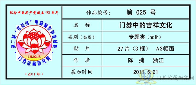 | 当前位置:【券集园地】-〖券集展示〗: 第二届“莲花奖”券集赛”参赛作品(025号)《门券中的吉祥文化》 |