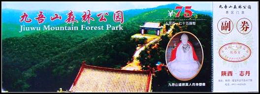 今年4月18日参观在西安举办全国旅游交易会,我有幸得到了一枚九吾山森林公园的门票。此票粗看设计得不错,大图采用九吾山俯瞰照片,林木茂密;又用一小图,为九吾山道教真人肉身塑像的照片,起到画龙点睛的作用。反面为九吾山美景小图几张、游客须知、游览路线图和简介。