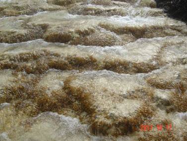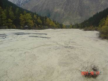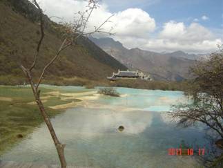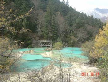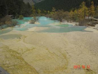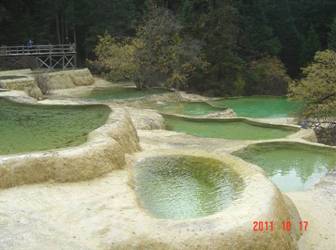 黄龙争艳池2 争艳池,计有彩池500多个, 池态有的形若荷花,有的状如莲叶,有的小可藏袖,有的大若亩田,形状殊异,参差错落。就其水质,清丽明辉,透视度高,水底枯枝苔藓,历历入目。因其水池深度各异,堤岸池底各具其色,水草分布差别较大,加上太阳光波的折射、反射和吸收, 各个池子异彩纷呈,争艳比美,竞秀斗奇,绮丽壮美,各领风骚。