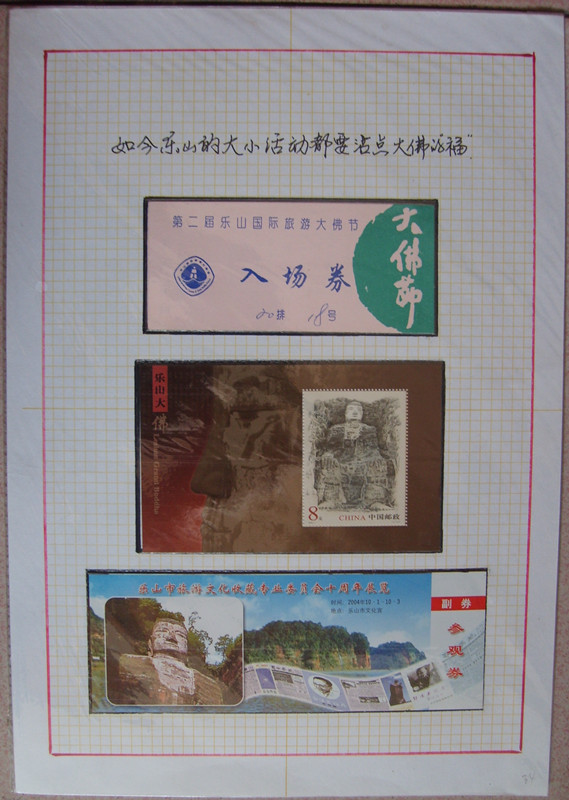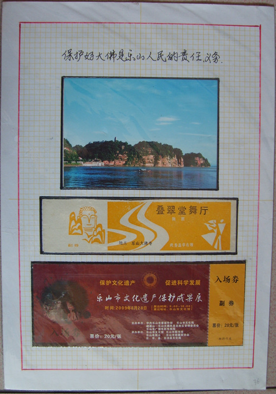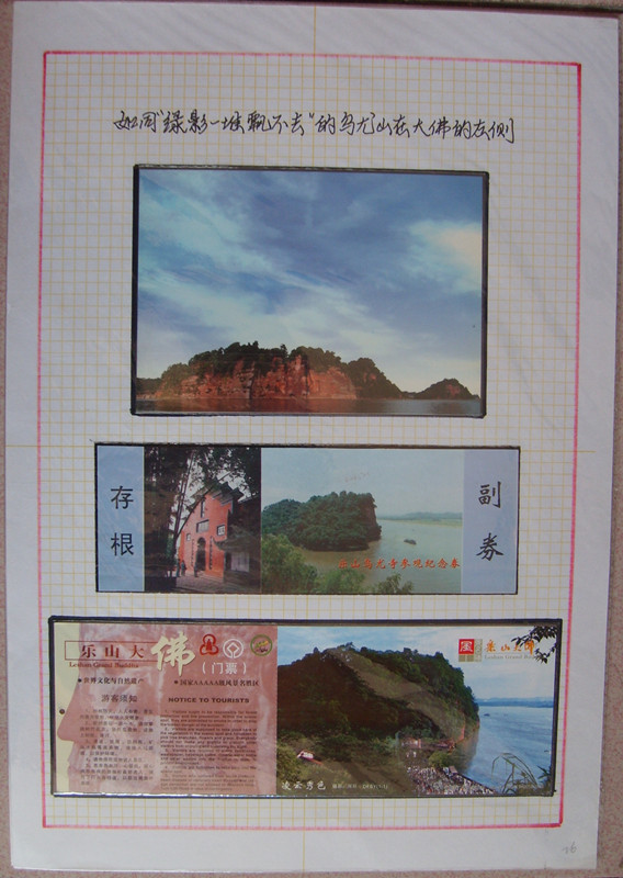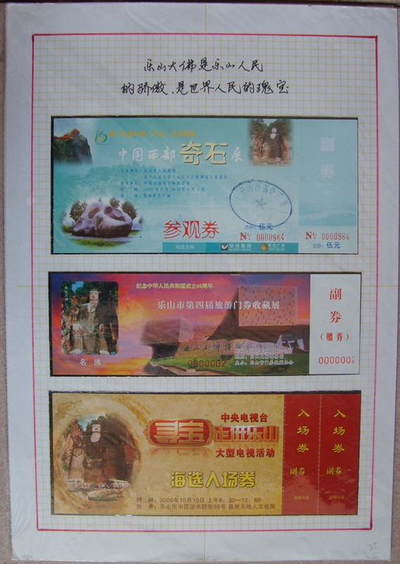 全面展示乐山雄,巧妙诠释大佛美,景区风貌满目秀,珍罕门券惹人醉!编排独到,美观欠缺。