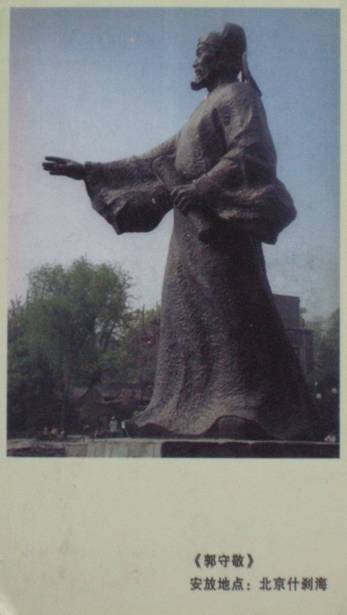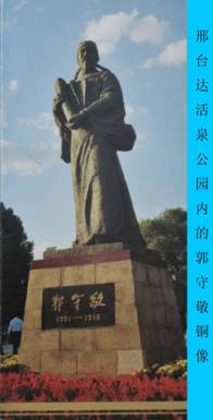 郭守敬与观星台 王学增 郭守敬(1231--1316)字若思,邢州(今邢台市)人,我国元代杰出的天文,水利,数学,仪器仪表制造家,我国古代八大科学家之一。 郭守敬少年时代跟随祖父郭荣学习数学,天文知识并拜名相刘秉忠为师在紫金山求学成为当代“紫山五杰”。 他对全天恒星进行了长期观测,编制《星表》二册是当时世界上收录恒星数目最多的星表。他主持建造元太史院是当时世界上一流的天文台并主持编制“授时历”是当时世界上最优秀历法,与世界上通行的公历--《格里历》数值一致。但比《格里历》早颁行301年。 1251年郭守敬在故乡邢州治水疏通达活泉造福乡里百姓。1264年西夏治水再现塞北江南,并挽舟溯流而上探寻黄河之源。1275年郭守敬实地考察山东,河北,河南,苏北一带水系交通,随后开凿会通河使南北运河直线贯通一路北上。1291年全权负责大都水系治理,通惠河的开凿和白浮引水成功,不仅解决了大都的漕运而且开辟了大都水源为都城的建设奠定了基础才有了北京城700多年定都史。在大都治水时合理布置闸坝节水行舟解决了高落差下通航难题,该方法至今仍在葛洲坝,三峡大坝,巴拿马运河中使用。 郭守敬一生研制了“大明殿灯漏”“简仪”等二十种仪器其中有十多项处于世界领先地位。 在北京汇通祠内建有纪念馆在他当年治水的积水潭畔矗立铜像。国际天文组织1970年将月球背面一环形山命名为“郭守敬山”,1977年又将南京天文台发现的2012号行星命为“郭守敬星”。