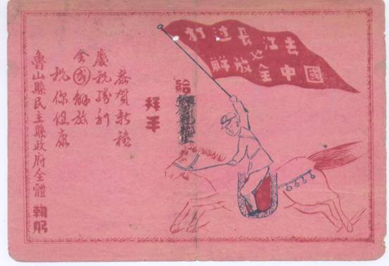 图一 1948年,一枚单面印制的贺年卡,画面是一人骑着一匹骏马,手中打着红旗(带锤头镰刀标志的党旗),红旗上写道:“打过长江去,解放全中国”,贺卡的内容是:“给***拜年 恭贺新禧、庆祝胜利、全国解放、祝你健康。鲁山县民主县政府全体鞠躬”。说明当时我国的中心任务是动员人民群众,作好支援人民解放军的工作,使解放军早日打过长江去,解放全中国。(图一)