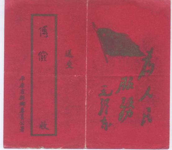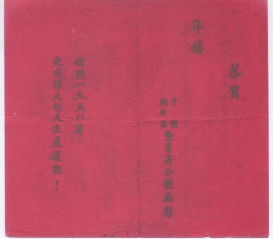 图二 1949年,一枚对折右翻式的贺年卡,里外是大红色,封面的内容是:送交**收,平原省新乡委员公属,里面的内容一面是:“恭贺年禧 于健、耿起昌暨专署全体鞠躬 ”一面是:“迎接1950年 完成伟大的大生产运动!”。底面是一面红旗,毛泽东题写的为人民服务。从内容中看到,新中国刚刚诞生,我国的主要任务是尽快恢复生产,提高人民的生活。(图二)