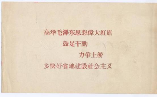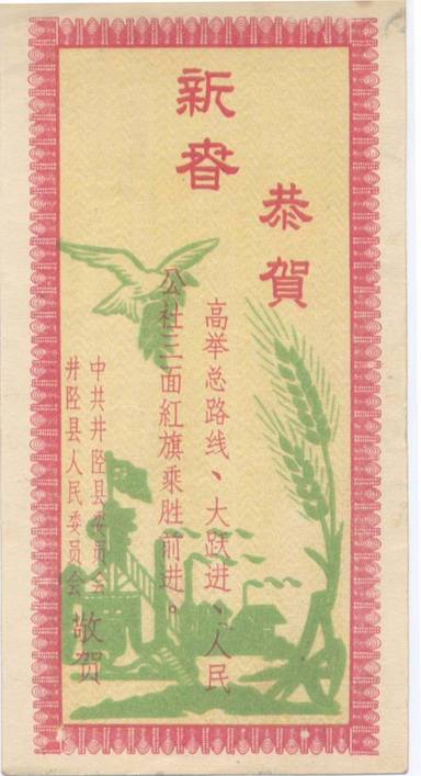 图三 1958年,一枚单面印制的贺年卡,设计的朴素淡雅,图文并茂,图中有和平鸽叼着橄榄枝、工厂、党旗、麦穗等,文字是:“恭贺新春高举总路线、人民公社、大跃进三面红旗乘胜前进。中共井陉县委员会、井陉县人民委员会 敬贺”。说明我国当时的中心任务是高举三面红旗、发展工业、农业生产。(图三)