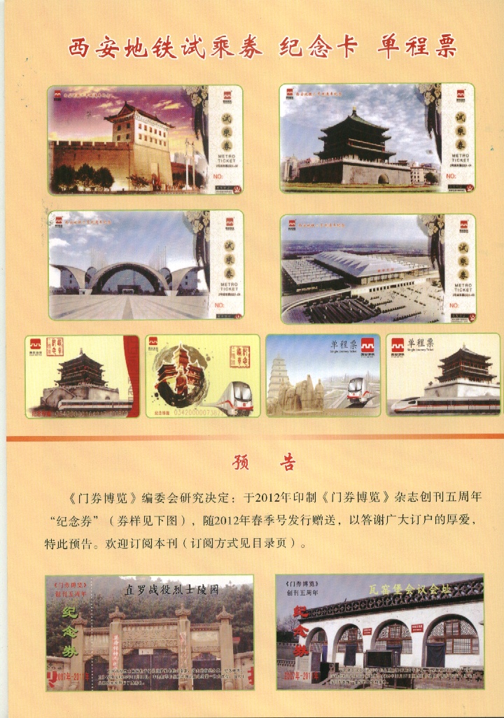 异彩纷呈的西安地铁 ——二号线开通纪念卡、试乘券、单程票 文/图 西安 宿景周 经过近二十年运作、五年筹备建设,西安地铁二号线中心区段(北客站至会展中心)于2011年9月16日建成通车正式营运。此时此刻,圆了西安人民期待已久的地铁梦。为了纪念这一重大盛事,西安市地下铁路有限责任公司制作了开通纪念册,册里装有纪念卡二枚和邮资明信片一枚。(大雁塔图)二枚开通卡主色调均为黄色,章显雍容华贵之气质,卡面图案为西安标志建筑钟楼、大雁塔、以及兵马俑,临潼博物馆,黄帝陵等图案。卡的背面印有使用须知,须知第4条特别指出 “本票用后可永久珍藏” ,足见此纪念卡之珍贵。(见插页图1、2、3、)