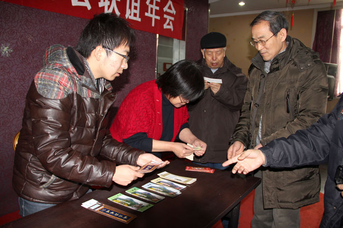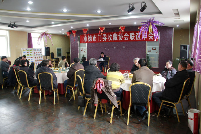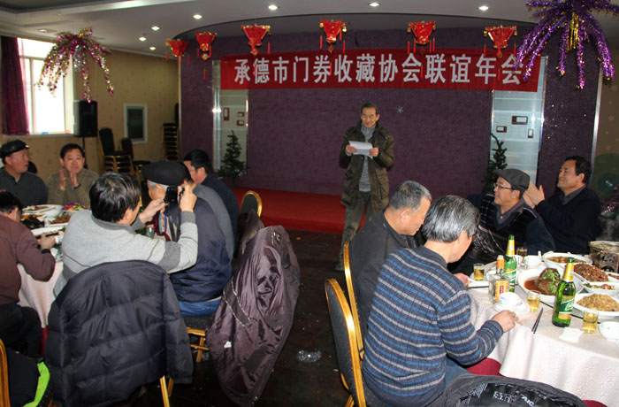 传承历史文化 守护精神家园 ——承德市门券协会召开2012年联谊年会 承德 寇瑞敏 2012年元月7曰上午,承德市门券协会在市区同心酒店召开了联谊年会,26位会员到会。会议主要有五项议程;一是由杨帆会长作工作报告。二是寇瑞敏付会长作增选理事及会员分组情况说明。三是由理事王天林作会费收支情况的报告。四是由于长泅、石德常、常甘生向全体会员赠送纪念券、贺卡等。 五是门券交流、观赏。六是举行迎新春联欢酒会。会议由张子玉秘书长主持。 会上,杨帆会长做了《传承历史文化,守护精神家园》的工作报告。他指出:2011年是和谐奋进的一年,一是协会坚持了健康的办会方向。传承历史文化,守护精神家园是会员们的共同信念,“我有你有大家有”是协会倡导的收藏理念,门券“四走进”(即进校园、进工厂、进社区、进军营)是收藏为社会大众服务的观念。二是形成了有特色的收藏队伍,通过门券为媒介,让我们过去不相识的人们情趣相投,建立起了纯朴真挚的友谊,在物欲横流的今天,大家能珍视尊重、友爱、互助、乐观、无私的传统美德,活动中体现出了整体意识、和大局观念。会员队伍不断发展壮大。三是探索和建立了券藏文化的新思路。协会积极倡导收藏文化观念,通过网络、报刊、电视、展览等媒介,创新宣传新方式,努力为社会精神文明建设服务取的一定效果。四是精心组织活动,提高协会的吸引力、凝聚力。协会组织会员参加了踏青赏花一日游;安排了旅游学院门券收藏展;组织了22人参加的河北第二届秦皇岛首届门券展;8名会员参加了市收藏家协会与北京市收藏家协会交流。活动中结织了朋友、丰富了藏品、开阔了视野,增强了团队精神。存在主要问题是协会内部的学习交流安排不够多,订刊报、上网学习交流不够重视;每人至少发一篇文章还没落实。 杨会长讲到: 豪情满怀迎接2012年,协会主要安排以下几项工作:一是继续抓好组织和队伍建设。每季度召开一次理事会议,研究本季度活动事宜。坚持正确的办会宗旨和理念,努力探索门券收藏的文化内涵,多形式实践门券收藏为社会文明服务。二是出好一本书。与市文物局联手印制完成《避暑山庄与外八庙门券大全》资料书的工作。三是组织好二个活动,即安排一次“四走进”门券文化下基层展览活动;安排一次快乐友情旅游活动。四是做好四项重点工作。 一季度组织好承前启后的协会联谊年会。 二季度结合世界文化遗产日组织好大型的宣传展览。 三季度组织安排会员积极筹备“十七届全国门券展览”参会参展工作,并以最大努力支持省协会办好十七届全国券展。 四季度安排门券专题制作讲座,交流会员集券经验,提高会员集券技能和水平。 另外,协会动员广大会员积极征订《中国旅游门券报》及《门券博览》等报刊,经常上门券研究网、朝花网。有一定基础的券友多动脑动手,参与撰文,促进交流。 会上寇瑞敏代表理事会就设立会员小组意见作了说明并宣布了小组组成及小组长。对理事会提名增加于长泅、常甘生为理事会理事一事,会员举手表决通过。会上高兴武向协会赠送了他录制的协会活动光盘。于长泅等会员向大家赠送了自己制作的纪念门卷及贺卡,会员之间还交流了门卷。 临近中午,大家合影留念,在同心攴厅举行了迎新春联谊酒会。席间会员们有备而来,各显才艺表演了唱歌,吹笛子,诗朗诵等节目,这次联谊年会筹备充分,气氛热烈,内容形式多样,在欢迎和祝福声中增进了会员间的交流与友情。