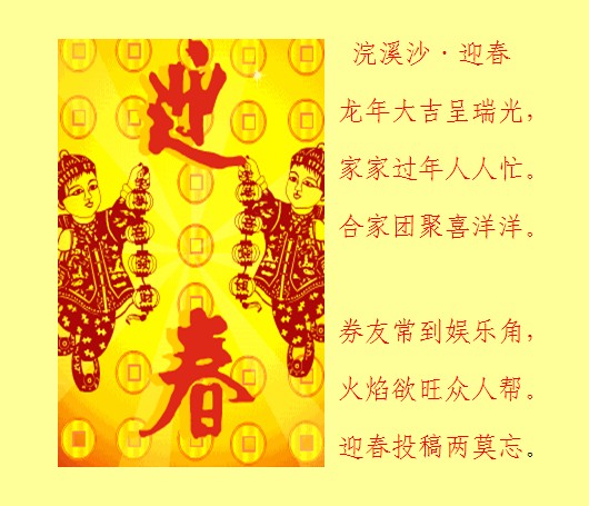 | 当前位置:【藏券研究】-〖券海拾贝〗: 金龙杯诗词会友稿件014号:浣溪沙•迎春 |