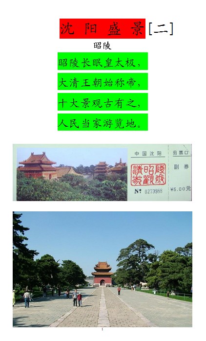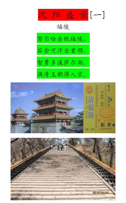 编后:赵义方先生的系列诗《沈阳盛景》是他在春节期间下工夫打造成的。他用十首诗描绘沈阳十景,且选配门券做成十幅彩页。 第一次在2月初发给我两首,随即展示了。第二次发来的8首稿件集中,从今天起连续展示。为使券友们保持欣赏的连续性,在展示《沈阳盛景3》时,再把《沈阳盛景1》、《沈阳盛景2》附上,请浏览。----郭林生