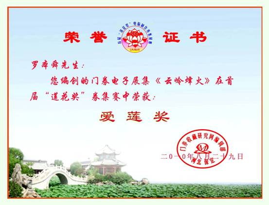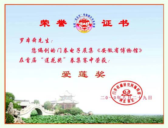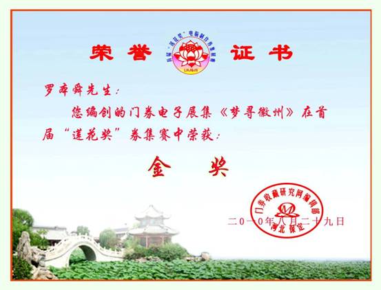 附:分享罗本舜老师在券研网活动获得的部分荣誉 一、在首届“莲花奖”券集赛中创作的三篇作品一篇获金奖,两篇获爱莲奖。