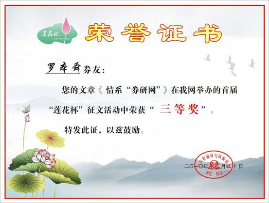 三、在首届“莲花杯”有奖征文中选送的《情系‘券研网’》获得三等奖。