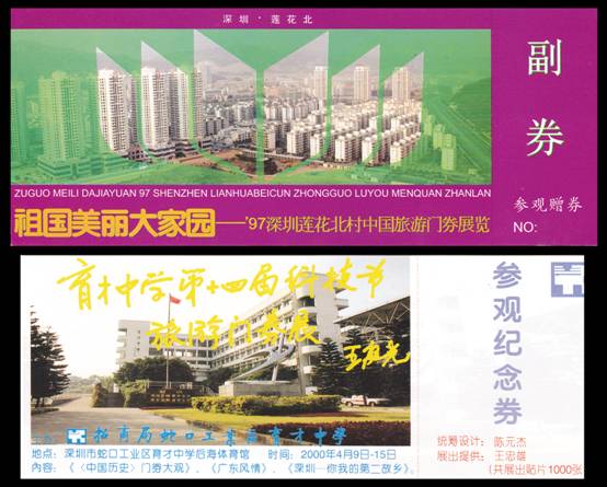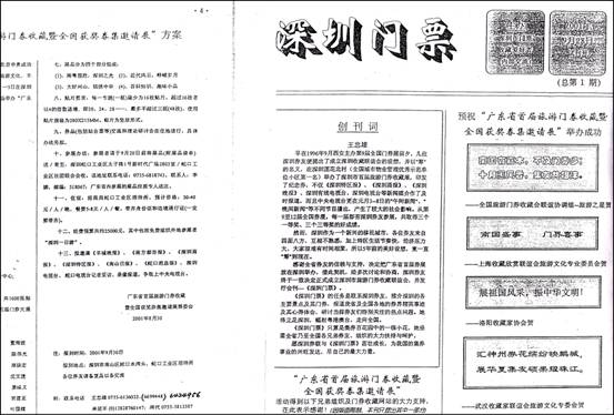 雨 人:我们也非常期待您的大作早日出版。96年,是什么原因让您想到要发起筹建“深圳市旅游门券收藏联谊会”?联谊会到2001年才正式成立,能说说这一路的艰辛历程吗? 王忠雄:96年国庆节西安主办全国九届展。深圳有两人参展,一部是我的《上古——秦史话》,另一部是深圳盐田港的券友(也是邮友)牛安先生的《故宫》。我们商量给组委会写幅贺词,为了响亮些,便打出“深圳市旅游门券收藏联谊会(筹)”的旗号。 97年元旦,我们又在深圳莲花北村(全国城市物业管理优秀示范单位第一名)举办了“深圳市首届旅游门票收藏展”。深圳三大报、两个电视台都作了报道。出乎我们意料的是,连中央电视台也在元月3日至8日的“午间新闻”、“晚间新闻”等不同节目频道中播出。因为我们都是在职人员,平时工作忙,平时都是单兵作战为主。2001年,为了在深圳筹办广东省首届旅游门券收藏展,更多的券友聚集起来了,热度升高了,经过多次讨论和协商,才在2001年11月11日通过《章程》,选出理事会,出版会刊《深圳门票》。