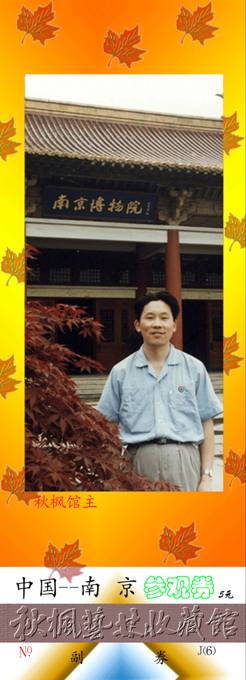 嘉宾简历 郭礼典 1956年6月生,属猴,双子座,南京栖霞摄山人,笔名秋枫,英文名(Guo Lidian)Edwin Guo( 含义:“有很多的朋友”A rich friend),人称“枫痴”,别号“天宫牧马”(高源篆印)、网名“九闲宫”,南京大学文博大专,馆员、民革党员。现任南京博物院专职文物摄影师。 1977开始涉入收藏活动、现藏品数量(20000)、主集门券方向(博物馆)、主集专题名称(博物馆、金陵风光、孙中山与辛亥革命)及门券数量(4000)。2005年10月18日,“秋枫艺林收藏馆”开馆,馆名由南京青年书法家陈蔚先生题写,并设计发行“秋枫藏馆”个性化纪念名片。爱好收藏书画、集邮、旅游门券、美女图烟标及简介、导游图等。曾多次在全国报刊、杂志上发表有关文物艺术、收藏鉴赏方面的文章,被同事戏称“半块豆腐”,并著有《旅游门券》、《南京博物院参观券》,其中《烟标》、《金陵胜迹图》、《方寸中的东方女性风采》等书待出版,深受全国各地集友的喜爱。1997年发表“门券与市场”和2010年“个性化馆券收藏意义”。 “一份耕耘,一份收获”,我能为收藏天地尽一份微薄之力是我最大的快乐。 通联:南京市尧佳路18号6-2-102 “秋枫艺林收藏馆” 邮编:210046 郭礼典 九闲宫 qfyl123@21cn.com 手机:13951819005