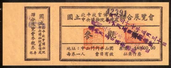 雨 人:在收藏过程中,有没有您特想要,但因各种原因最后失之交臂,至今想起来还觉得甚为遗憾的门券?在您众多的藏品中,您最喜欢的是哪张(套)门券? 郭礼典:记得在一位集友手中见过一套早期“山西省博物馆”参观券,当时无钱购买,至今想起来还觉得甚为遗憾。最喜欢的是民国“故宫博物院、中央博物院联合展券”,它是记录抗战时期“国宝—南迁文物”的铁证。