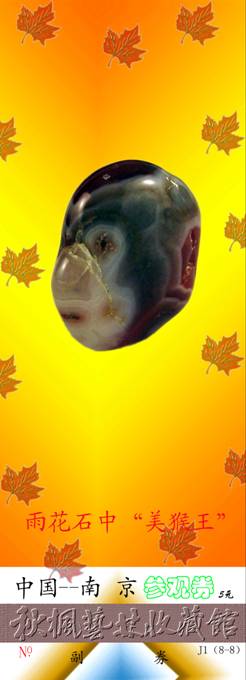 第二件宝贝是“美猴王”雨花石。南京有三大宝“桂花鸭、云锦、雨花石”,从吃的穿的到玩的都有,唯独小小的雨花石,令中外游客刮目相看。而中国四大观赏奇石中的天然“雨花石”最为引人注目,它以小巧玲珑、美妙神奇闻名于世,受到广大游客的喜爱,为之收藏。 我收藏的这款“美猴王”雨花石,高为30mm,头部眼、耳、鼻、口五官俱全,眉清目秀,形态惟妙惟肖、栩栩如生,宛如大圣又回人间,可谓是“仙猴”。它具备了雨花石六美特征:质美、形美、纹美、色美、呈像美、意境美。二十年来一直珍藏在“秋枫艺林收藏馆”中,秘不示人,是该馆镇馆之宝。我为此还专门从南京十竹斋文物商店买了一方寿山石印材,刻上篆书“仙猴石主”阳文印章。