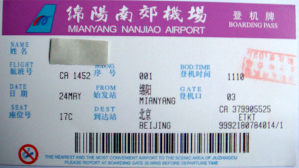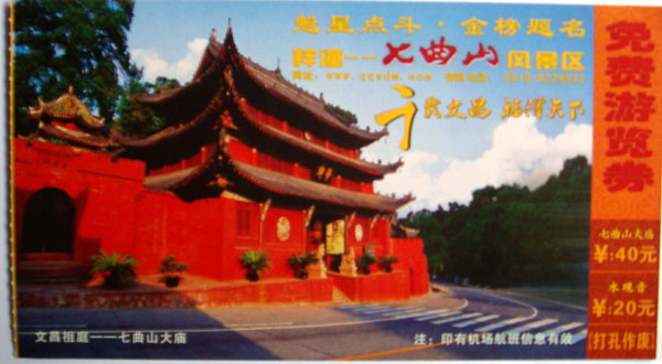 近日得到一枚登机牌附带免费游览券,它是绵阳南郊机场的登机牌,打印着乘客姓名、航班号、日期、座位号、始发站、到达站、登记时间、登机口等信息,背面是梓潼七曲山风景区免费游览券,注明七曲山大庙40元,水观音20元的门券原价,特别注明:印有机场航班信息有效,看来这是航空公司吸引乘客和旅游景点扩大影响的一项措施,乘客在转乘间隙可以免费游览景点也是一件好事。 登机牌正面 登机牌背面
