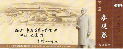 | 当前位置:【藏券研究】-〖佳券赏析〗: 铁岭市周恩来少年读书旧址纪念馆门券 |