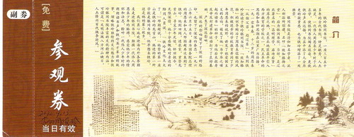 最近,收到浙江富阳券友周银铃寄来的门券。其中有一枚铁岭市周恩来少年读书旧址纪念馆的免费门券,非常喜欢。 门券为纸质免费券,长 门券背面与券面色调、风格基本一致。上部的简介中介绍了银冈书院的历史沿革和地位,周恩来在此读书的经历。下部是水墨画和题跋。本人知识浅薄,不识此画,用放大镜也未看清题跋的字迹。希望有识券友指教。(附门券正、反面)