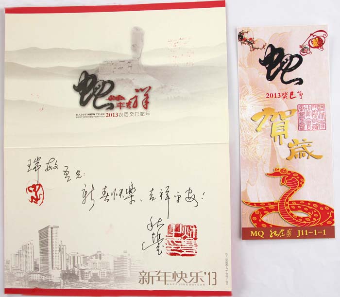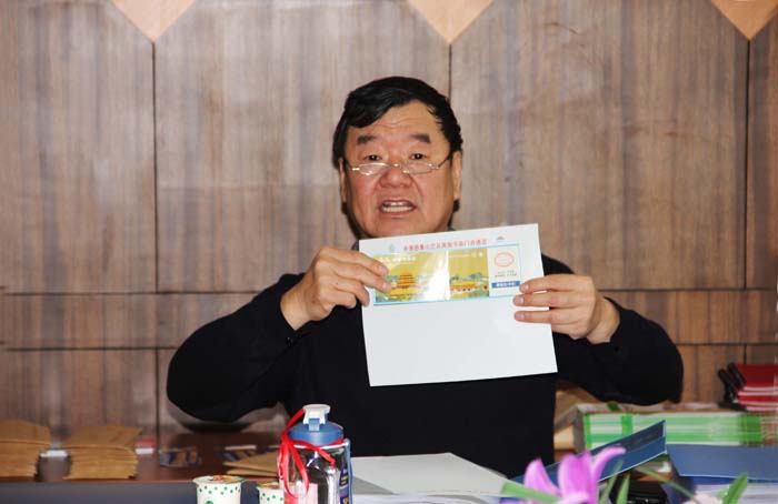 张子玉代于长泅展示制作赠送的门券、贺卡