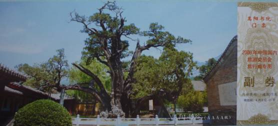 九、中华第一柏—汉封“将军柏” 在嵩阳书院的东侧,有一侏高大无比的古柏,其树龄约在4000年以上,是中国现存最古老的柏树。汉封将军柏原三棵,是汉武帝游嵩山时因见树高大而封之为大将军柏,二将军柏和三将军柏。三将军柏清初被火烧毁,现存大将军柏和二将军柏,其中二将军柏较为壮观,它高约30米,围径15米,虽然树皮剥落,躯干龙钟,但依然生机盎然。树干下部有一枯孔,南北相穿,好象一座门庭过道,洞中能容数人,两根弯曲如翼的庞然大干枝,左右伸张,形若雄鹰展翅,又如金鸡欲飞。著名诗人赵朴初曾留下"嵩阳有周柏,阅世三千岁"的诗句。