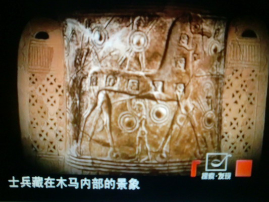 1961年在希腊某岛上,发现了一个瓶外绘有内藏士兵的木马图案密克诺花瓶,,它为特洛伊木马提供了唯一的实物的依据