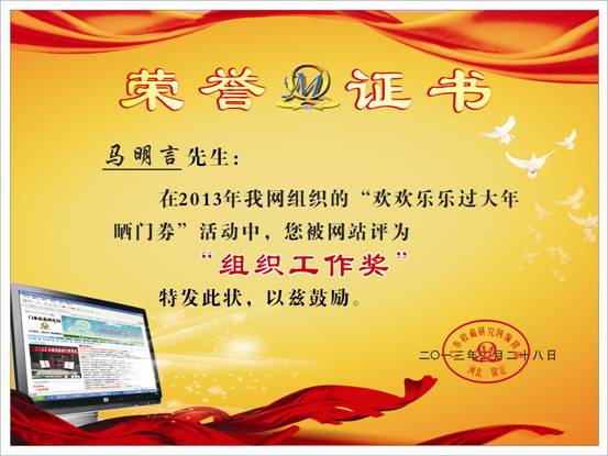 门券收藏研究网编辑部 2013.2.1日 附件:一、荣誉证书式样