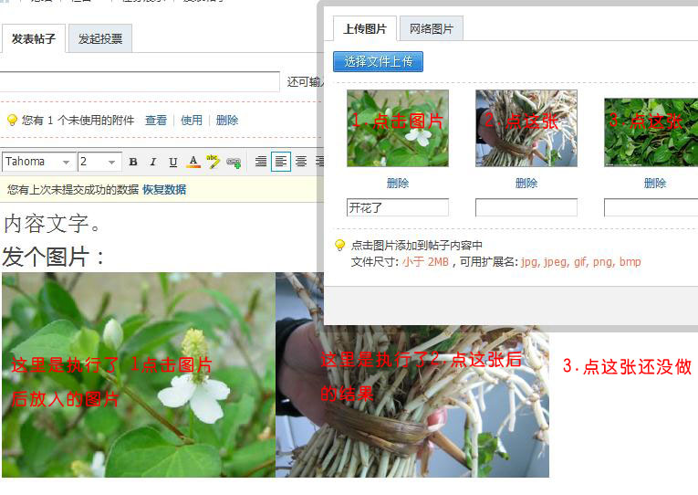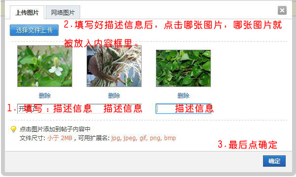 看上图,图片就被传到网上了,填写描述信息(可以不填),按想要的顺序点击图片,将其放入内容框里。