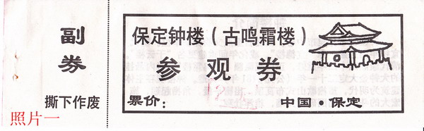 保定古鸣霜楼小有名气,座落在保定繁华热闹的裕华路上,是一座典雅优美的古代建筑,与直隶总督署、古莲花池、大慈阁交相呼映,并列生辉,同为古城保定的代表符号。但其门券却是枚简易单色门券(见照片一),票价只有2元,券面仅印有“保定钟楼(古鸣霜楼)参观券”字样,右上边印有线条勾画的钟楼图案,虽然只是数笔勾勒,倒很形象,有一定的欣赏价值。背面印有“钟楼简介”。欣赏之余想到与钟楼有关的福城大列瓜的传说故事,老叟讲给朋友听。