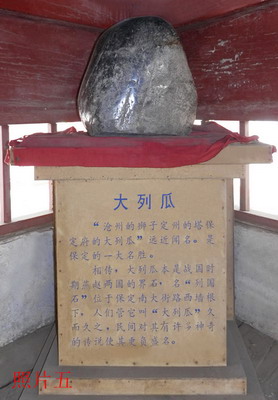 在钟楼二层的角落还摆放着一块“石头”,这就是民间传说的“沧州狮子定州塔,保定府的大列瓜”,(见照片五)大列瓜便是保定古老的标志。看来不起眼,在保定人的眼里“大列瓜”可神奇了,原位于保定市南大街路东的安祥胡同对面路西墙根,就像一个西瓜大小露出地面一半,表面明光锃亮。笔者1954年从北京毕业,分配保定工作,就听说“大列瓜”的故事,赶紧到现场一观,印象深刻。传说这“大列瓜”原在一家商铺柜台旁,人来人往观看影响买卖,想挖掉它,挖了半天没挖到根。当时在保定担任直隶总督的曹锟也到现场察看,听到有人说“大列瓜”没有底。他说:“我就不信,这块小小的石头怎么会没底?”于是兴师动众,刨了好多天,越刨石头越大,终于没有刨到底。从此观看“大列瓜”的人越来越多,于是掌柜的制作了一个假“大列瓜”埋在临街的墙角。改革开放后,南大街改造,这个“大列瓜”被刨出,启初放在保定商场一楼大厅展览,后才移至保定钟楼,供人永远观看。其实,这“大列瓜”,据说是战国时燕赵两国的界石,名曰列国石,民间取其形叫“大列瓜”。