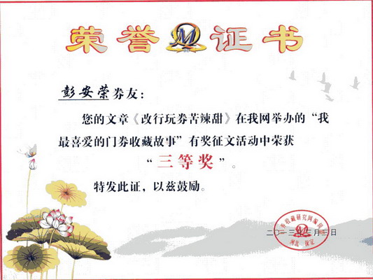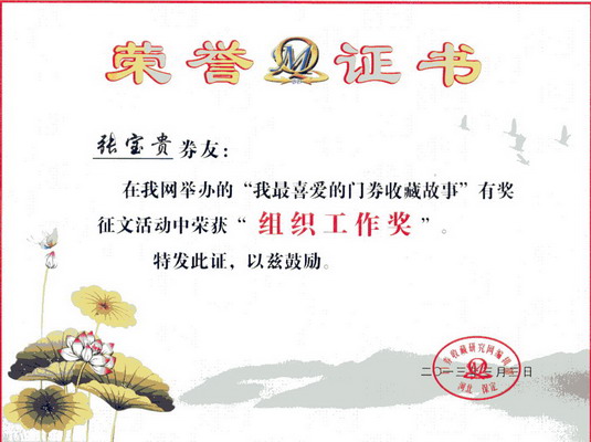 | 当前位置:【券坛史料】-〖网站活动〗: “我最喜爱的门券收藏故事”有奖征文相关证书和纪念券印出待寄 |