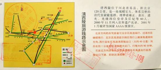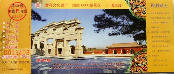 为与券友们分享,笔者在现场拍摄了这六种门票的图案,限于条件,图片效果一般,请理解。 清西陵景区发放门票一枚。 据了解,清西陵景区在这次活动中发放的就是正在使用的通票,票价120元,可游览4个黄帝陵、永福寺和崇妃园寝。