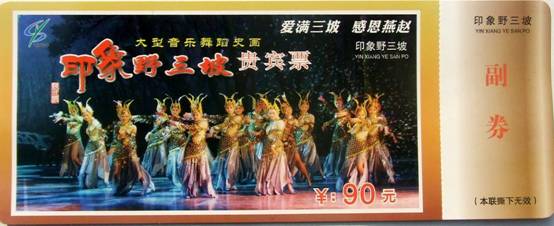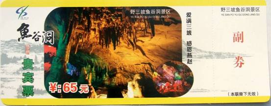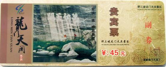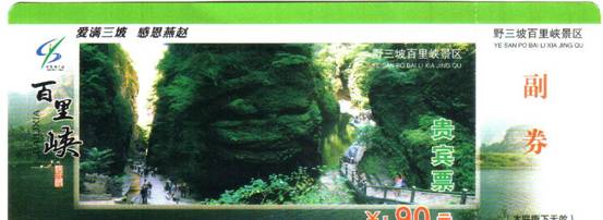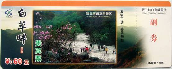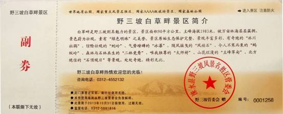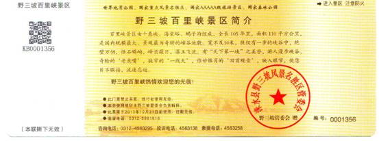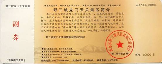 清西陵通票背面 清西陵通票的背面加盖了一个圆形章和3个长条形戳记。左上角的圆形章是“清西陵文物管理处门票收费专用章”;左下角的条形戳不太清晰,仔细辨认为“禁止旅游社使用和倒卖,请持此票到售票处兑换通票”;中间的戳记有“抽奖专用”4个字;右下角表示的此票的使用时间“有效期2013年4月—10月”,哈哈,够复杂的吧。 野三坡景区发放门票5枚。 分别是百里峡、白草畔、龙门天关、鱼骨洞景区和大型音乐舞蹈史诗“印象野三坡”贵宾票。