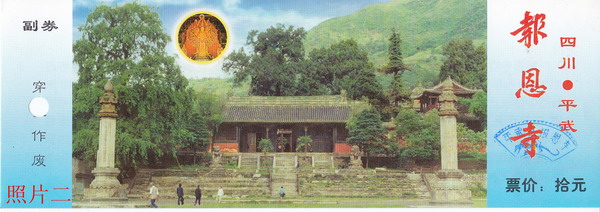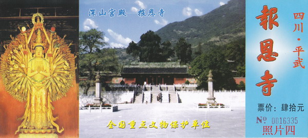 笔者收藏有四枚四川平武报恩寺——深山宫殿门券(见照片一至四),券面设计均为报恩寺宫殿摄影图案,有点遗憾的是图案不甚清晰,但并不影响欣赏,欣赏之余想起“深山龙宫”的传说故事,讲给朋友听。