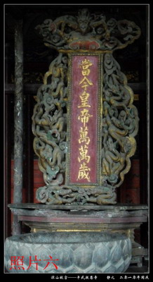 明正统五年,相传四川平武龙安府佥事王玺,有了势力,银子也就多了起来,王玺、王鉴父子,计划仿照明代宫殿建造他的府第,想当“土皇上”。他趁进京朝贡之机,暗地以重金招聘曾经修建紫禁城的工匠,仿紫禁城建造大兴土木,历经七载建成了一座金碧辉煌的宫殿,可称“深山宫殿”。王玺要当“土皇上”和建宫殿的事,有人告了密,皇帝派钦差大臣专程去调查。王玺知道后,吓得魂不附体,他深知这是灭九族之大罪,其亲信给出主意。于是令雕工塑匠,增制了天王金刚,赶制了观音佛像,又设立了“当今皇帝万万岁”的九龙牌位(见照片五)。钦差大臣一路游山玩水,为王玺工程改造赢得了时间,当钦差大臣抵达龙安时,只见“报恩寺”三个大字金匾高悬,天王金刚威武雄壮,千手观音慈祥肃穆,于是叹曰:“此非王府.实属庙也!”王氏又以金银细软美女贿赂。钦差回朝便竭力为王玺美言,特别强调了主殿设“当今皇帝万万岁”九龙牌位,皇帝转怒为喜,便赦免王玺死罪,又将“报恩寺”改为“敕修报恩寺”(见照片六)。