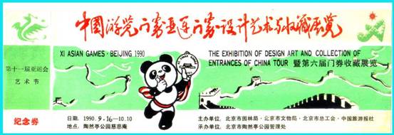 届展资源共享——往届点滴(06)第六届 题目:中国旅游门券亚运会门券设计艺术及收藏展览暨第六届门券收藏展览 时间:1990年7月24日至10月10日(66天,券界展览史上时间最长) 地点:北京陶然亭公园慈悲庵 主办:北京市园林局 北京市文物局 北京市总工会 中国旅游报社 承办:北京陶然亭管理处 展品:本届展品分为设计艺术部分和门券专题部分。前者有全国各地景区、博物馆、纪念馆、公园等80各单位提供的400余枚门券作品;后者有全国21个省(市、自治区)108位门券收藏爱好者提供的117个专题、1350张贴片、5593枚门券参展。 评奖:设计艺术部分评出了一等奖1个、二等奖3个、三等奖5个。优秀奖15个。门券专题部分评出一等奖1部、二等奖3部,三等奖5部,优秀奖20部。 纪念券: 本次展览组委会印制了两枚纪念券和展览纪念册,刻制了3枚纪念戳。(限于手中资料,仅展示一枚纪念券)